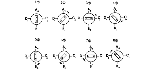• Возбуждение одной фазы, потом – двух, потом – одной и т.д., чтобы ротор двигался поэтапно, вращаясь в квадранте. Эта последовательность известна как «ступенчатый метод половины». Полуволна имеет большой угол вращения за шаг двигателя, но слабый вращающий момент (рис. 1.7).