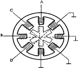 Двигатель переменного магнитного поля оснащен ротором из нена-магниченного мягкого железа с меньшим количеством полюсов, чем статор (рис. 1.8). При этом используется униполярный метод возбуждения пары полюсов статора, чтобы повернуть ротор к полюсам возбуждаемой обмотки ступенчато. Здесь также используют три различных последовательности возбуждения фаз: