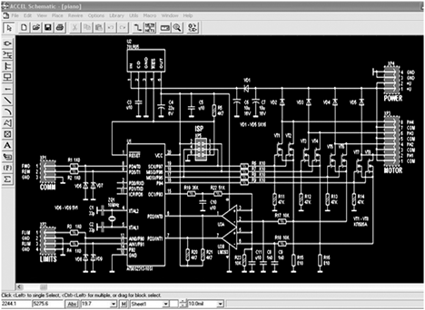 После разработки структуры аппаратных и программных средств дальнейшая работа над контроллером может быть распараллелена. Разработка аппаратных средств включает в себя разработку общей принципиальной схемы, разводку топологии плат, монтаж макета и его автономную отладку. На этапе ввода принципиальной схемы и разработки топологии используются, как правило, распространенные системы проектирования типа «ACCEL EDA» или «OrCad».