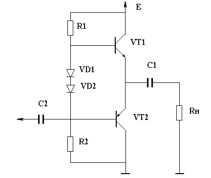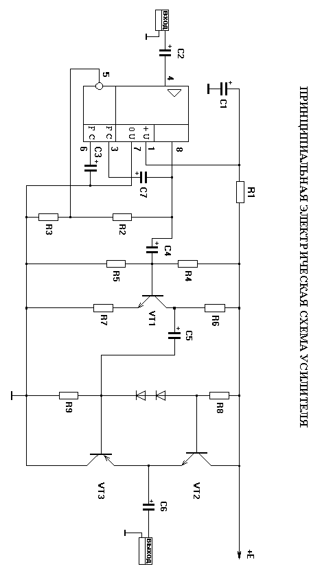 В схеме оконечного каскада для задания рабочего напряжения используются делитель напряжения, диод в прямом включении, комплиментарные транзисторы, что дает возможность осуществить работу схемы от одного источника. Чтобы обеспечить работу каскадов усиления мощности используют предварительные каскады усиления мощности. В этих каскадах учитывали влияние входного сопротивления последующего каскада. Для уменьшения нелинейных искажений ввели отрицательную обратную связь.