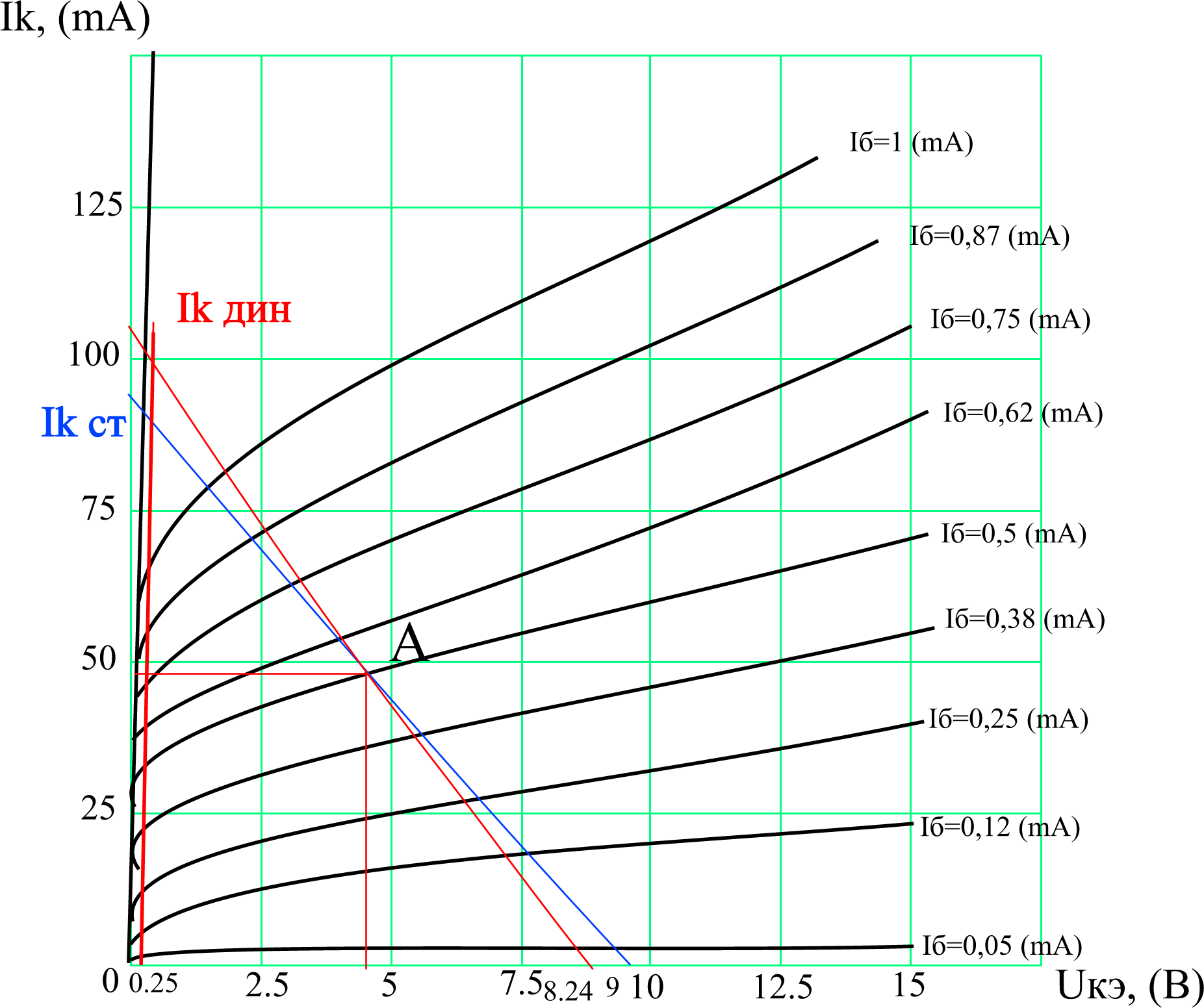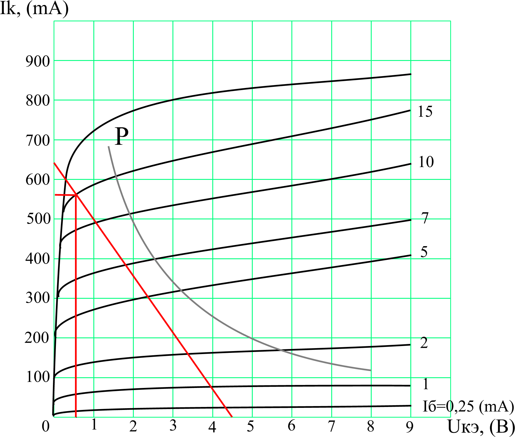 В системе координат выходной характеристики строим треугольник мощности: прямая Uнач. отсекает область существенной нелинейности токов базы, от Uнач. откладываем величину Uкэ, затем соединяем точки Iк и Uкэ. Далее строим Рк доп- нагрузочная кривая, которая в данных расчётах не должна заходить в область треугольника мощности, но максимально приближаться к нему. Из этого следует, что транзисторы работают без радиаторов.