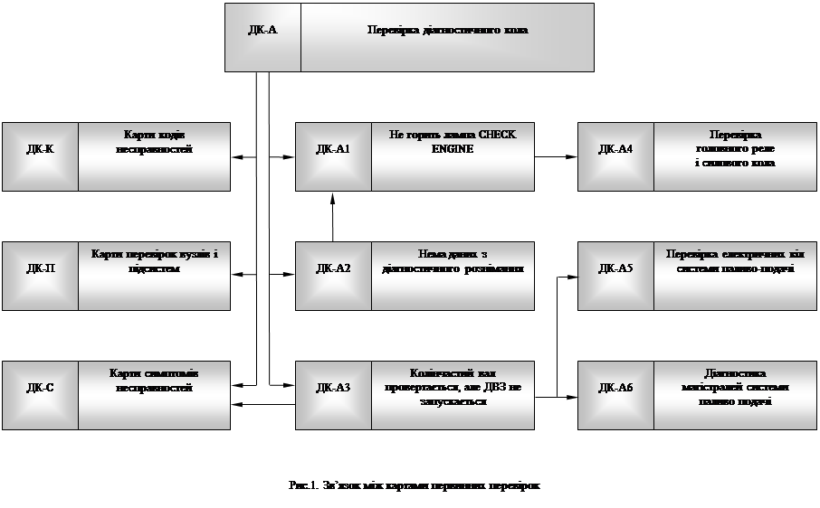 Перш ніж приступити до діагностування системи керування ДВЗ, слід виконати первинні перевірки за діагностичними картами ДК-А. Результати первинних перевірок дозволяють уникнути зайвих та помилкових втручань при локалізації несправності, пов’язаних з непрацездатністю системи діагностики та врахувати симптоми та коди несправностей, що виникли на час проведення діагностичних операцій.