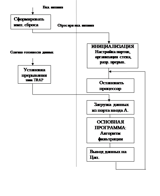 Программа инициализации завершается остановом МП. Из состояния останова МП выводится сигналом INTRA , поступающим на вход TRAP МП. Последующие операции выполняются под управлением рабочей программы фильтра. Выполнение рабочей программы - это реакция