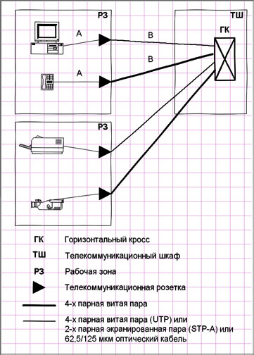 В проекте реализована традиционная топология звезды на основе неэкранированных 4-х парных кабелей UTP категории 5e, кроме того, используется архитектура одноточечного управления, то есть все коммутационное оборудование находится в одном месте - в помещении серверной. Расстояние от серверной до любого рабочего места не превышает максимально возможную длину кабеля, разрешенную стандартом для данного уровня иерархии.