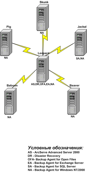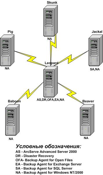 В качестве системы резервного копирования выбран программный продукт ARCServe производства фирмы CA. Схема резервного копирования приведена на рисунке «Схема резервного копирования». ARCServe имеет клиент-серверную архитектуру, данные копируются на магнитную ленту.