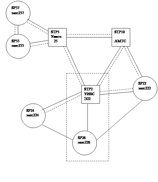 Исходными данными к проекту служат схема ГТС с УВС (рис. 1), на которой необходимо спроектировать ОКС№7 и таблица емкостей пучков каналов между станциями вторичных сетей (табл. 1).