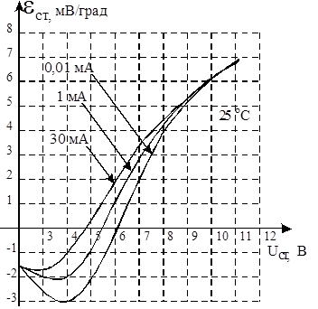 Рис. 5. Зависимость ТКН Стабилитронов от напряжения стабилизации и рабочего тока |