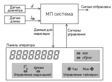 Цифровые сигналы с датчиков диаметра и длины бревна поступают в систему, формируется сигнал отбраковки. Затем система, имитируя калькулятор, рассчитывает Vi и обновляет сумму V S , храня эти величины в памяти. В зависимости от двух кнопок управления индикацией (одна из них, будучи нажатой, переводит в отжатое положение другую) на индикаторах отображается V S или текущее время. Для начальной установки часов есть 2 кнопки управления таймером, увеличивающие на единицу часы и минуты. Имеется кнопка включения/выключения питания “Вкл”.