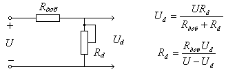 Датчик диаметра устроен следующим образом: бревно, двигаясь по конвейеру, отклоняет пластину -, вращающуюся на горизонтальной оси, на угол a. Этот угол через редуктор - подается на ось переменного резистора. Переменный резистор Rd включен в потенциометрический датчик (рис.3). Напряжение Ud с этого датчика подается в МП систему, где оцифровывается с помощью АЦП.