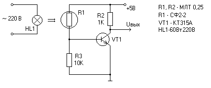Лампа HL1 – обычная лампа накаливания, ее свет сфокусирован отражателем на “своем” светоприемнике. Если свет доходит до светоприемника (бревно не загораживает) то транзистор открыт, на выходе фотоэлемента низкий уровень (0), иначе (в темноте) на выходе высокий уровень (1). Выходы Фэл1 и Фэл2 являются входами МП системы.
