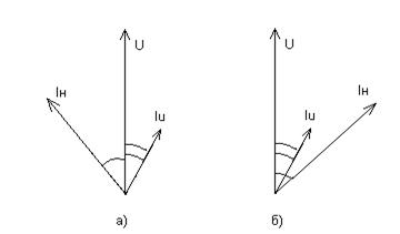 На рисунке 2 приведены векторные диаграммы электродинамического ваттметра, включенного в цепь переменного однофазного тока с активно-индуктивной (рис. 2б) и активно-ёмкостной ( рис. 2а) нагрузками.