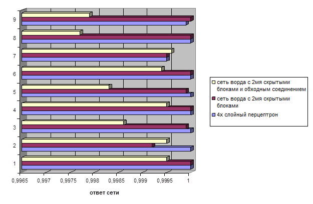 На данной диаграмме показаны сравниваемые нами значения выходных данных обученных сетей.