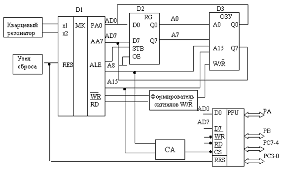 Процессорный блок состоит из микроконтроллера i8086, регистра защелки младшей части адреса RG. Адрес формируется на выходе портов РА – младшая часть adr(0..7) на внутренней шине AdrDat, которая попадает на системную шину адреса после регистра защелки Adr, и РС – старшая часть, которая непосредственно подается на системную Adr - разряды adr(8..15). Обмен данными с памятью и внешними устройствами, осуществляется как по внутренней шине Dat, которая совмещена с шиной младшей части адреса и подключена к порту РА dat(0..7)=adr(0..7), так и по порту РС.