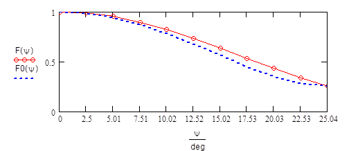 Рассчитаем допуск на установку облучателя в плоскости, перпендикулярной фокальной. Он вычисляется из условия, что коэффициент направленного действия антенны снижается на 10%.