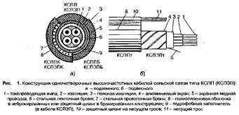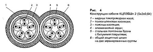 Конструктивные параметры соответствующих марок герметизированных и не герметизированных кабелей унифицированы. Кабели содержат четыре медные жилы со сплошной полиэтиленовой изоляцией, скрученные в звездную четверку с шагом не более 150 мм и 170 мм. В четверке две жилы, расположенные по диагонали, образуют пару. Изоляция обеих жил первой пары имеет натуральный цвет, второй пары - синий цвет. Поверх скрученного сердечника накладываются последовательно поясная изоляция в виде трубки из полиэтилена и экран из алюминиевой отожженной ленты с перекрытием не менее 10%. Под экраном должна быть проложена продольно медная луженая проволока диаметром 0,3-0,4 мм. Свободный объем под поясной изоляцией герметизированных кабелей заполнен гидрофобным компаундом, который вводится в сердечник одновременно с наложением поясной изоляции. Поверх экрана накладываются: в небронированных кабелях - трубчатая полиэтиленовая оболочка, в бронированных - КСГШБ - броня из стальной ленты с битумным покрытием, в кабелях КСППК - ПВХ лента, оцинкованные круглые стальные проволоки и защитный полиэтиленовый шланг. Самонесущие кабели имеют встроенный несущий трос в общей оболочке с сердечником, образующий конструкцию «восьмерка».