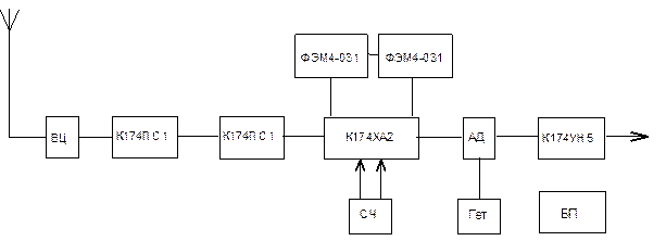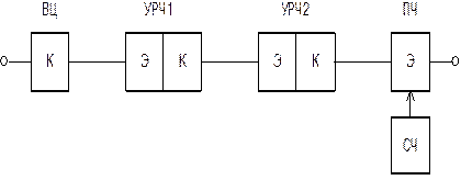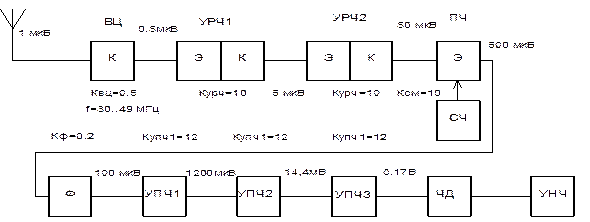 17) Нарисовать полученную структурную схему, написать типы транзисторов (ИМС) в каскадах (трактах), частоты, величины входных сигналов каскадов и коэффициент усиления в них.