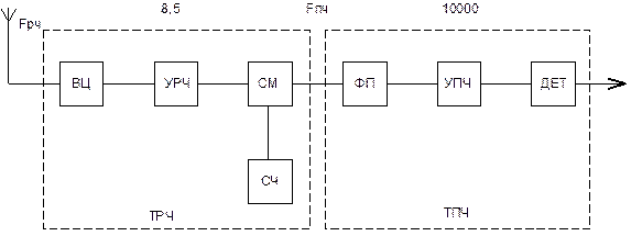 Нарисуем схему (Рис.5) супергетеродинного приемника.
