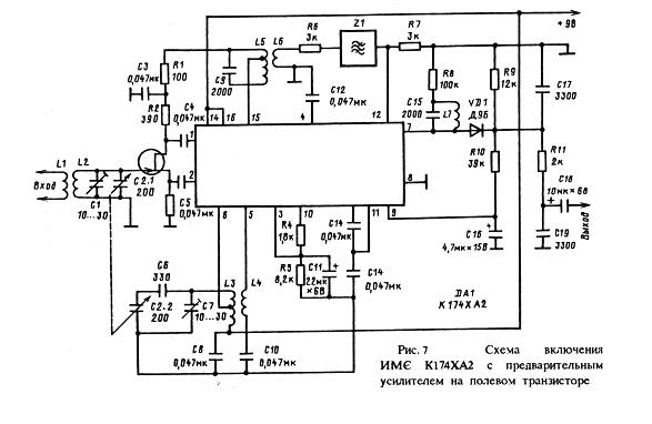 Схема включения микросхемы с предварительным усилением на полевом транзисторе приведена на рисунке ниже. Селекцию входного сигнала осуществляет контур L2C1C2.1. Частота колебаний гетеродина определяется контуром L3C2.2C6C7. Сигнал разностной частоты выделяется контуром L5C9 и последующим полосовым фильтром Z1. С усилителя ПЧ через контур L7C15 сигнал приходит в детектор на диоде VD1. RC фильтр R10C16 выделяет напряжение АРУ и оно подается на вывод 9.