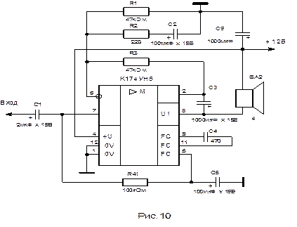 УНЧ строится на микросхеме К174УН5 (рис.10), это операционный усилитель, нагруженный на низкоомную нагрузку.