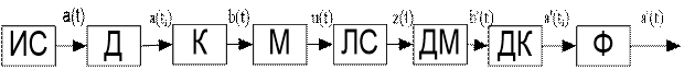 ИС – источник сообщения; Д – дискретизатор; К – кодер; ЛС – линия связи; ДМ – демодулятор; ДК – декодер; Ф – фильтр-восстановитель.