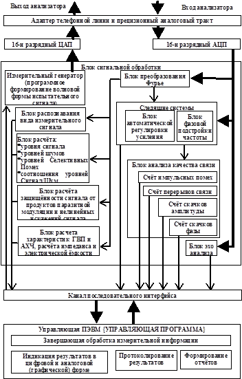 Измерительно-анализирующий блок обеспечивает мониторинг (измерение и протоколирование) тестируемых каналов связи с использованием собственного или внешнего генератора испытательных сигналов. При этом в зависимости от автоматически определяемого вида входного сигнала анализатор автоматически включает измерение тех параметров, для измерения которых и предназначен соответствующий измерительный сигнал.