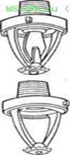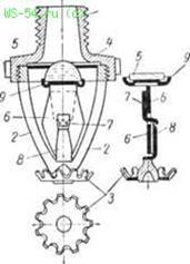 Спринклерные головки — специальные насадки (рис.2) — ввертывают в трубы на расстоянии около 3—4 м одна от другой. Отверстия спринклеров закрыты стеклянными клапанами 5, удерживаемыми замком из медных или латунных пластинок 6—8. Последние спаяны легкоплавким сплавом (припоем) с температурой плавления 72, 93, 141 и 182°. При повышении температуры, вызываемой пожаром, припой распаивается и замок 6—8 падает, открывая при этом отверстие спринклера. Вода, вытекающая под напором через отверстие, разбрызгивается при помощи розетки 3.