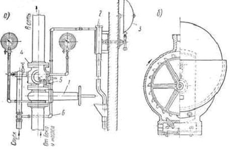 Контрольно-сигнальный клапан (рис. 3) служит для подачи воды в спринклерную сеть через главную задвижку 1 с одновременной сигнализацией о пожаре при помощи водяной турбины 2 и колокола 3. Как только открывается хотя бы один спринклер в помещении, давление в сети над контрольным клапаном 4 падает. Более высокое давление воды снизу выводит тарельчатый клапан 5 из равновесия, приподнимает его; поступающая снизу вода попадает к водяной турбине по трубопроводу 6.