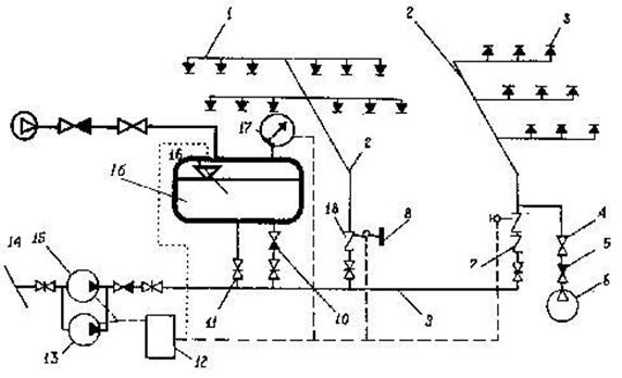 Сигнал о пожаре вырабатывается сигнальным прибором 8 УУ. Прибор управления 12 при получении сигнала включает рабочий насос 15, а при его отказе резервный насос 13. При выходе насоса на заданный режим работы автоматический водопитатель 16 отключается с помощью обратного клапана 10.