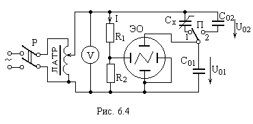 , подается на горизонтальные пластины осциллографа и на вольтметр V