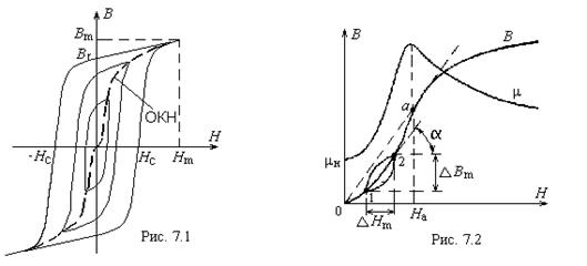 На рис. 7.2 показана основная кривая намагничивания B = (H ) и зависимость абсолютной магнитной проницаемости от напряженности внешнего магнитного поля. При определенной величине напряженности m достигает максимума. Точка а, характеризующая этот режим, соответствует касательной Оа, проведенной к основной кривой намагничивания из начала координат. Проницаемость, определенную в очень слабых полях, называют начальной (m н ).