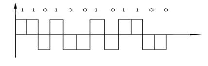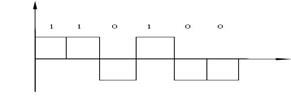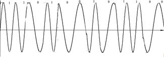 . Модулятор ─ це пристрій який здійснює модуляцію, тобто вкладання інформаційного сигналу в сигнал-перенощик (гармонічний сигнал, який виконує функцію перенощика енергії в радіоефірі).Він призначений для узгодження інформаційного сигналу з лінією зв’язку. Загальний принцип модуляції полягає в зміні одного чи декількох параметрів несучого коливання f(a,b,…,t) в згідності з повідомленням. Для цифрового сигналу модуляція називається маніпуляцією. У нашому випадку застосовується гармонічний сигнал перенощик і ЧМ маніпуляція (“1” передається з частотою f1