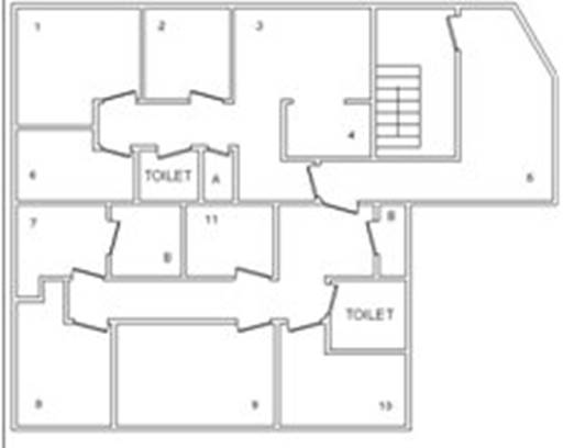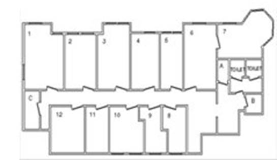 Размеры здания приблизительно 30м на 15м. Предварительный обзор здания показал, что три комнаты могут быть потенциально использованы для аппаратных комнат. На плане они показаны буквами A, B, C.
