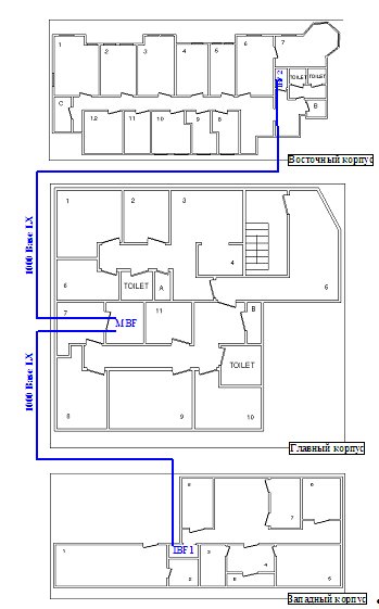 Необходимо разработать план кабельной системы для связи в сеть всех компьютеров во всех трех зданиях, на основании предположения о том, что в каждой пронумерованной комнате находятся два компьютера. План должен отражать: