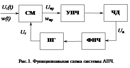 Система ЧАП, включаемая в состав приемника, работает следующим образом. Напряжение с выхода УПЧ подается на частотный дискриминатор (ЧД). При появлении отклонения промежуточной частоты сигнала от её номинального значения, которое совпадает с центральной частотой УПЧ, на выходе дискриминатора появляется напряжение, зависящее от величины и знака отклонения D w . Выходное напряжение дискриминатора, пройдя через фильтр нижних частот (ФНЧ), поступает на подстраиваемый генератор (ПГ) и изменяет его частоту, а следовательно, и промежуточную частоту сигнала так, что исходное рассогласование D w уменьшается.