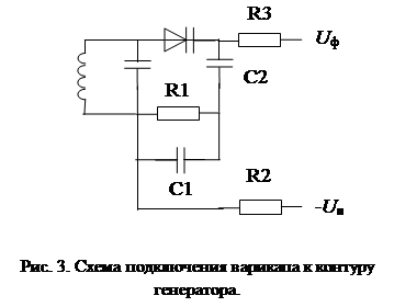Изменение частоты подстраиваемого генератора достигается подключением к контуру генератора управляющего элемента, обладающего регулируемым реактивным сопротивлением. В качестве такого элемента может использоваться, например, варикап. Простейшая схема подключения варикапа к контуру генератора показана на рис. 3.