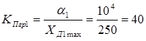 Петлевой коэффициент выбирается из трех условий, два из которых относятся к стационарному режиму. По первому условию необходимо обеспечить величину динамической ошибки при воздействиях, обеспечивающих постоянное значение ошибки в стационарном режиме: включение линейно меняющегося воздействия. Необходимое значение коэффициента передачи находится с помощью формулы: