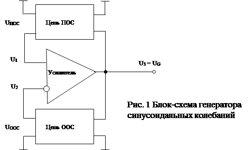 RC – генератор гармонических колебаний – представляет собой усилитель, охваченный двумя обратными связями: положительной и отрицательной – рис. 1.