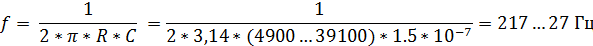 можно определить ёмкость C, подставив в (1) частоту f »1,05×fmax. Выбрав значение ёмкости в пределах 30…300 нФ, следует уточнить R//,после чего по той же формуле найти Rmax, подставив f = 0.95×fmin.