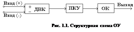 Структурная схема. Операционный усилитель, выполненный в виде интегральной микросхемы, имеет в своем составе: дифференциальный входной каскад (ДВК), промежуточные каскады усиления (ПКУ) и оконечный каскад (ОК), рис. 1.1.