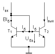 При таком включении UКЭ =UБЭ >UКЭ.нас . Следовательно, транзистор Т1 ненасыщен. Поскольку UБЭ1 =UБЭ2 , то при хорошо согласованных по параметрам транзисторах IБ1 =IБ2 =IБ и IК1 =IК2 =BIБ , где B - статический коэффициент передачи тока. При этом