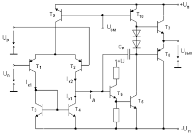 Выходной каскад представляет собой двухтактный комплементарный эмиттерный повторитель на транзисторах Т7 , Т8 . Напряжение на участке цепи из двух последовательных диодов, включенных в прямом направлении, обеспечивает малый начальный ток покоя этих транзисторов (режим класса АВ), что позволяет устранить переходные искажения сигнала. Такая схема обеспечивает симметрию выходного сопротивления ОУ при различной полярности выходного напряжения. Как правило, выходной каскад включает цепи защиты от короткого замыкания выхода.