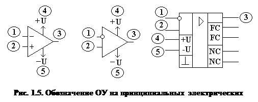 Обозначение ОУ на принципиальных схемах. Любой ОУ имеет не менее пяти выводов: два входных (инвертирующий и неинвертирующий), два вывода для подключения питания и один выходной вывод. Варианты обозначения операционных усилителей на принципиальных схемах представлены на рис. 1.5 (1 – инвертирующий вход, 2 – неинвертирующий вход, 3 – выход, 4 и 5 – выводы для подключения источника питания).