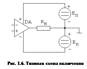 Подключение ОУ к источнику питания. В общем случае для работы операционного усилителя требуется двухполярный (расщепленный) источник питания; типичные значения напряжений источника составляют ±6 В; ±12 В; ±15 В (иногда ±18 В). Схема подключения ОУ к двухполярному источнику питания и нагрузке представлена на рис. 1.6.
