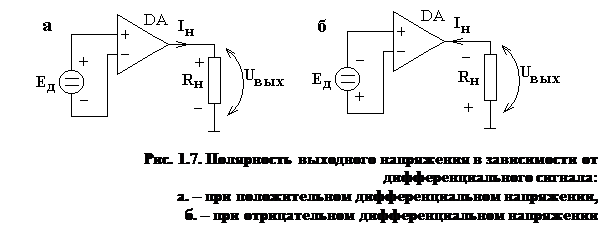 (напряжение на входе (+) положительно по отношению к напряжению на входе (–)), тогда выходное напряжение положительно, рис. 1.7,а.
