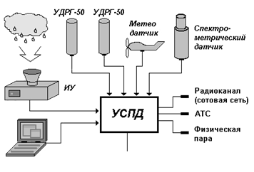 Базовим пристроєм для побудови постів контролю (ПК) служить блок ПЗПД (пристрій збору і передачі даних). Разом з радіаційним датчиком типу УДРГ-50, датчиком вітру типу М-127м (М-128), автоматизованими датчиками контролю забруднення атмосфери, інформаційним табло "біжучий рядок" і іншими пристроями в різних їхніх сполученнях ПЗПД дозволяє створювати пости контролю різноманітного призначення. Можливість прийому ПЗПД із високою вірогідністю команд керування (інформації) з центра дозволяє будувати на його базі системи з дистанційним керуванням.