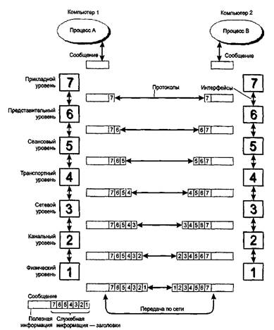 Согласно модели, средства взаимодействия делятся на семь уровней: прикладной, представительный, сеансовый, транспортный, сетевой, канальный и физический. Каждый уровень имеет дело с одним определенным аспектом взаимодействия сетевых устройств. Взаимодействие компонентов модели OSI можно проиллюстрировать на следующем примере. Пусть приложение обращается с запросом к прикладному уровню, например к файловой службе. На основании этого запроса программное обеспечение прикладного уровня формирует сообщение стандартного формата. Обычное сообщение состоит из заголовка и поля данных. Заголовок содержит служебную информацию, которую необходимо передать через сеть прикладному уровню машины-адресата, чтобы сообщить ему, какую работу надо выполнить. В рассматриваемом случае заголовок должен содержать служебную информацию о месте нахождения файла и о типе операции, которую необходимо над ним выполнить. Поле данных сообщения может быть пустым или содержать данные, которые необходимо записать в удаленный файл. Для того чтобы доставить эту информацию по назначению, необходимо пройти ряд этапов, выполняемых нижележащими уровнями.