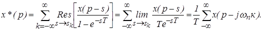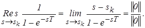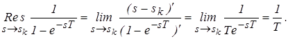 Полюса расположены на мнимой оси комплексной плоскости. Один из них расположен в точке ноль, а остальные лежат на мнимой оси с шагом wп = 2p/Т, где wп – частота прерывания. Определим вычет в одном из полюсов.