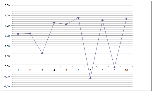 З отриманого виразу одномірної щільності ймовірності миттєвих значень повідомлення х (t ) будуємо випадковий процес (рисунок 1.2). У даному випадку побудовано графік із 10 випадкових точок: