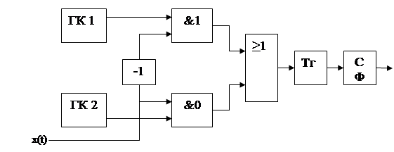 ГТІ – генератор коливань, -1 – інвертор, ≥1 – елемент АБО, Тг – тригер з лічильниковим входом, СФ – смуговий фільтр.