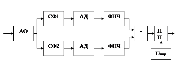 АО – амплітудний обмежувач сигналів (обмежує рівень прийнятого сигналу для виключення паразитної амплітудної модуляції). СФ – смугові фільтри (налаштовані на відповідну смугу частот), АД – амплітудний детектор (виділяє обвідну сигналу на виході смугового фільтру), ФНЧ – фільтр низьких частот (придушує залишки несучої і вищих гармонік на виході АД, наближає форму прийнятого сигналу до форми переданого)